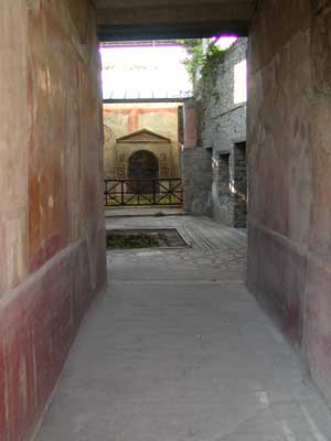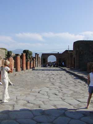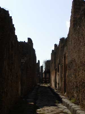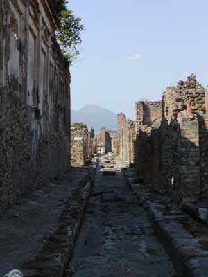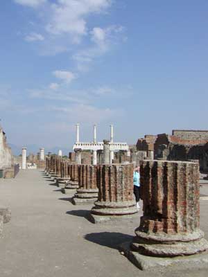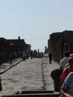 Here we are exiting the city. The tall white pillar in the background is part of the ruins of the temple of Venus. Like the Temple of Apollo, the Temple of Venus was destroyed during an earthquake prior to the eruption and was being rebuilt.