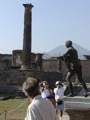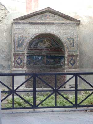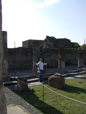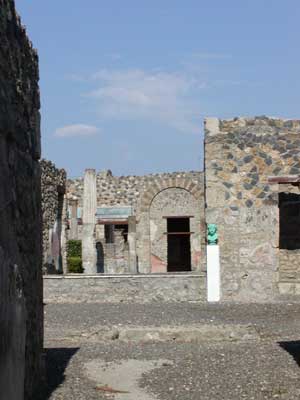 Here are the remains of a Pompeiian home. In the center is a replica of a bronze bust that was found during excavation. Most of the artifacts were removed from the site and are on display in the nearby museum of Naples.