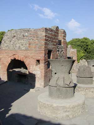 This is the remains of a bakery. To the left you can see the oven and on the right are the large mills, made from volcanic rock, that were used to grind the flour and make the dough. Further to the right (but not seen in this picture) were tables used to work the dough and racks to cool the loaves of bread.