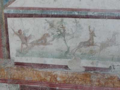 A close up of one of the painting shows a man hunting a deer with a cheetah.
