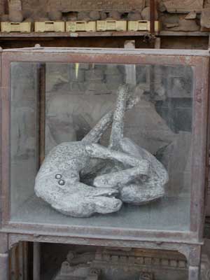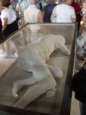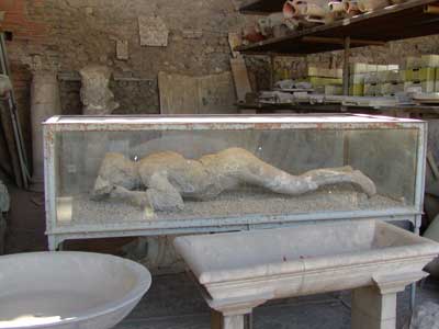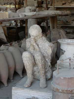 The warehouses of Pompeii have been converted to hold and protect artifacts uncovered during excavation. (They estimate that up to one fifth of the city is still uncovered.) Here we see the remains of a pregnant woman trying to protect her belly.